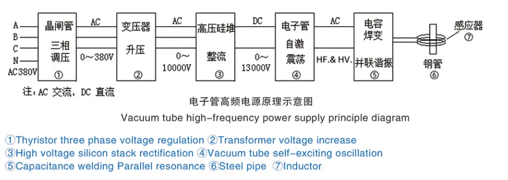 Normalny przemysłowy prąd przemienny (trójfazowy, cztery przewody 380 V/50 Hz w Chinach) jest przekształcany na regulowane napięcie prądu przemiennego w zakresie od 0 do 380 V (częstotliwość bez zmian) przez tyrystorowy regulator napięcia prądu przemiennego, a następnie zwiększany do wysokiego napięcia prawie 10000 V (częstotliwość bez zmian) za pomocą transformatora, a następnie prostowany przez obwód prostownika wysokiego napięcia do dziesiątek tysięcy wysokiego napięcia prądu stałego, a następnie oscylowany za pomocą lampy próżniowej do HF i HV prądu, a następnie poprzez rezonans równoległy LC w celu wzmocnienia prądu oscylacyjnego, a po obniżeniu napięcia zasilanie cewki indukcyjnej używanej do nagrzewania rur stalowych i innych przedmiotów obrabianych itp.