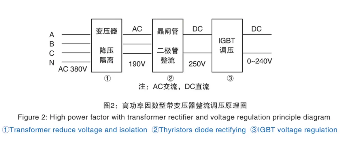 1. Klasyfikacja według prostowania regulacji napięcia: Tyrystory (SCR) mogą być używane do jednoczesnego prostowania i regulacji napięcia lub najpierw użyć diody lub tyrystorów do prostowania, a następnie użyć IGBT do regulacji napięcia. Zastosowanie regulatora napięcia IGBT ma na celu poprawę współczynnika wyposażenia. Może zaoszczędzić energię elektryczną i jeszcze bardziej poprawić jakość spawania.